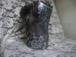 Eyelets, ribbons and a bow with a black rose completed the finished look.